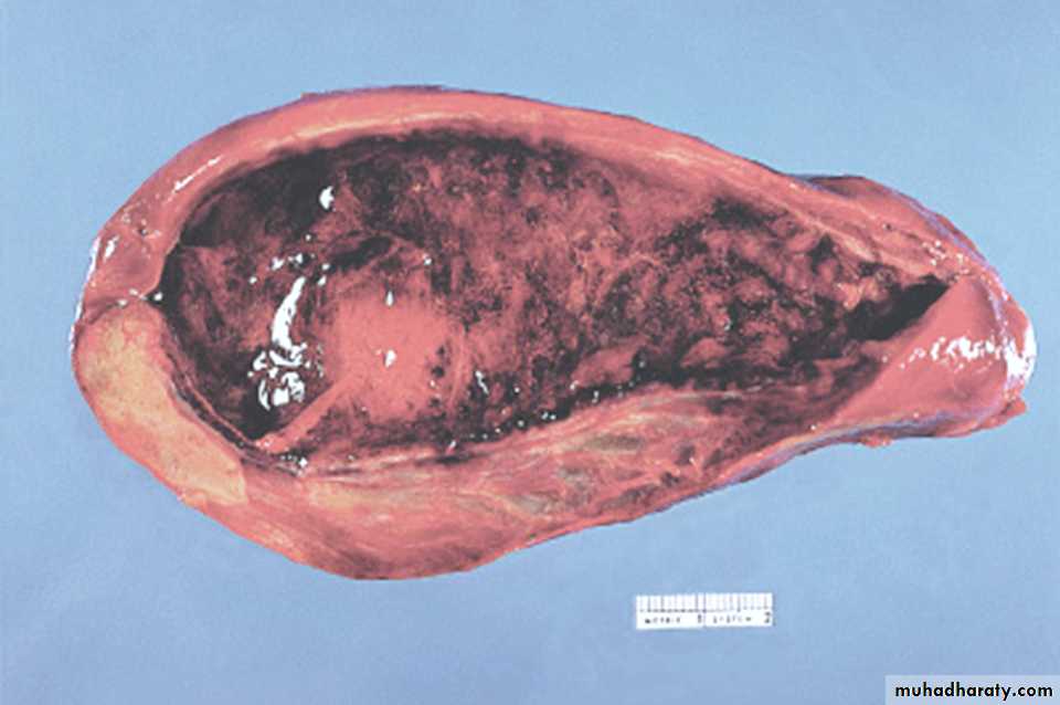 Mechanical manipulation during laparoscopic cholecystectomy has caused fragmentation of several yellow cholesterol gallstones, the interiors are black because of entrapped bile pigments. Note the faceted outlines. The gallbladder mucosa is reddened and irregular as a result of coexistent acute and chronic cholecystitis.Pigment stones may arise anywhere in the biliary tree (gall bladder, intra- or extra-hepatic bile ducts) and are either black or brown.