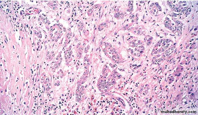 The cancer is usually hard, gray-white, poorly defined mass.