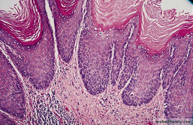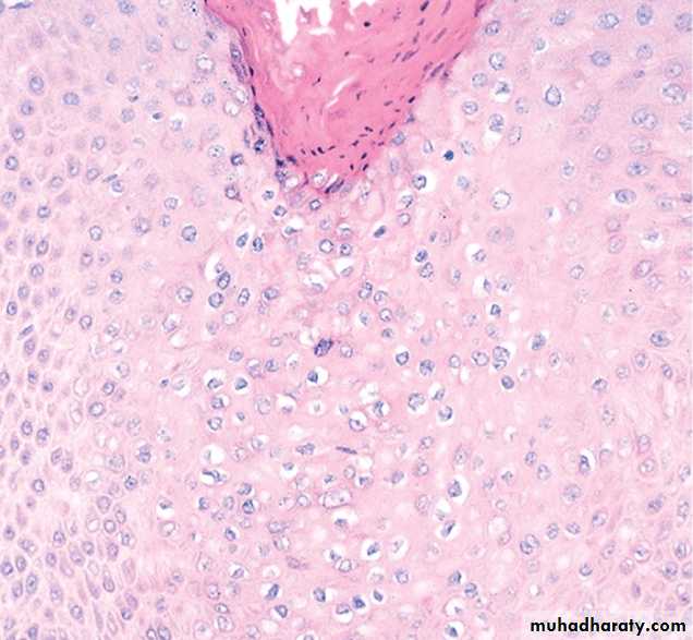 There is thickening of the epidermis (acanthosis), hyper/parakeratosis, and cytoplasmic vacuolation (koilocytosis, center).