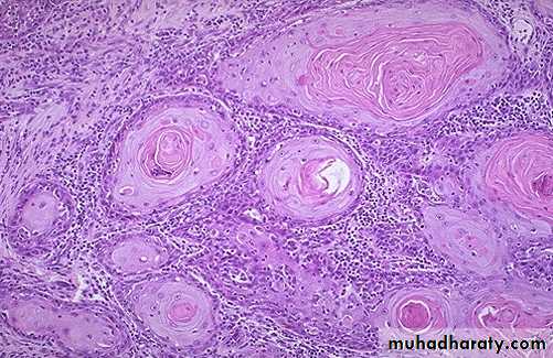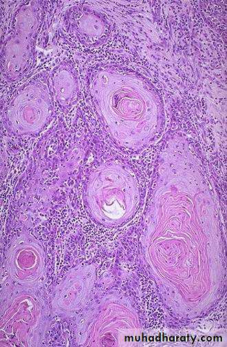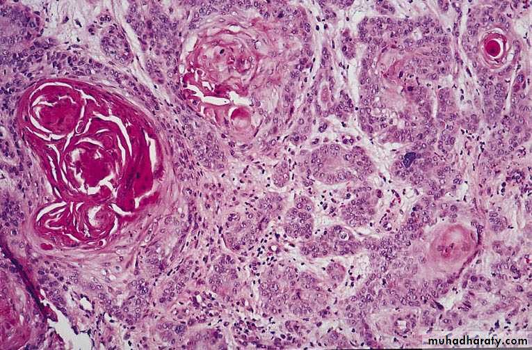 Variably sized, invasive, squamous nests some with central keratinization.