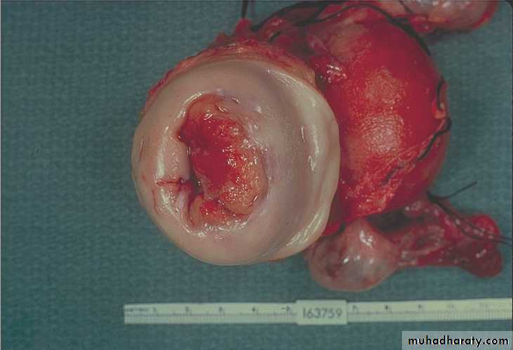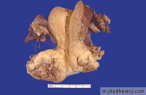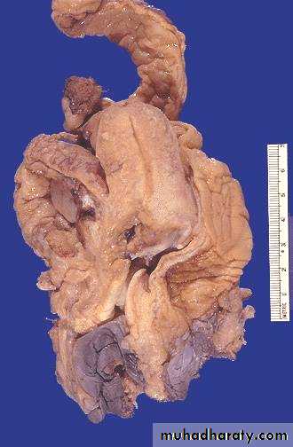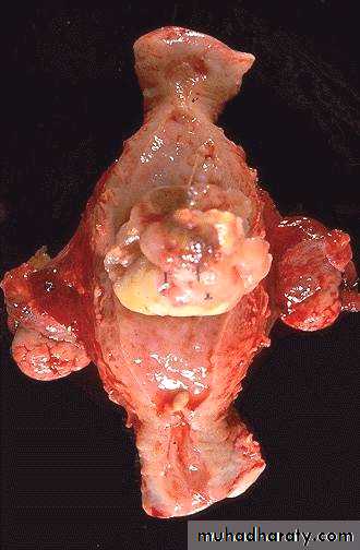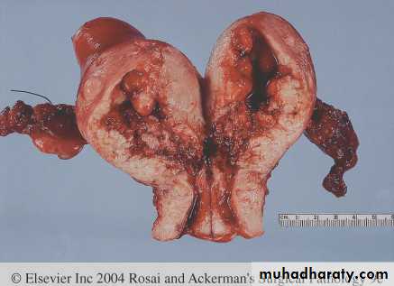 Endometrial adenocarcinomaThe tumor shown is extensive, nodular & highly infiltrating.