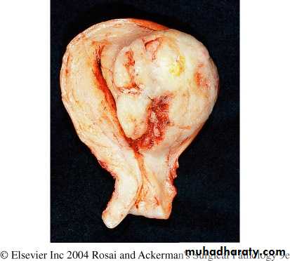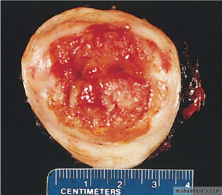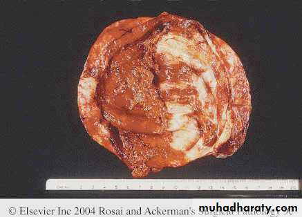 Larger neoplasms may show foci of ischemic necrosis with areas of hemorrhage and cystic softening (red degeneration)