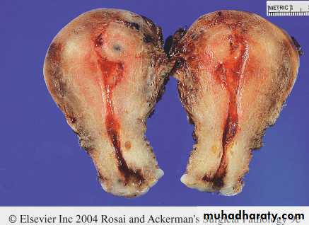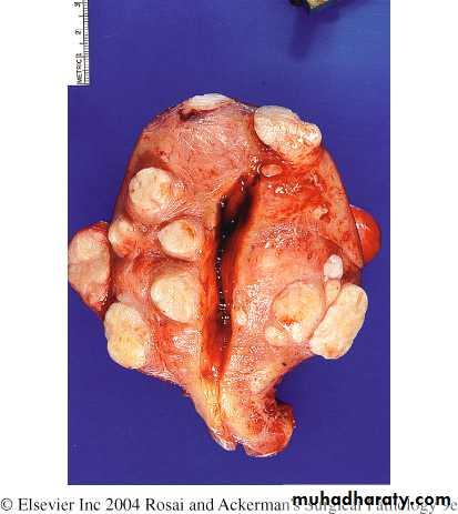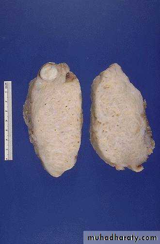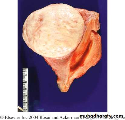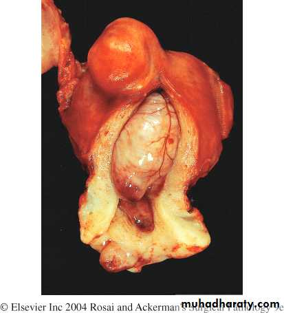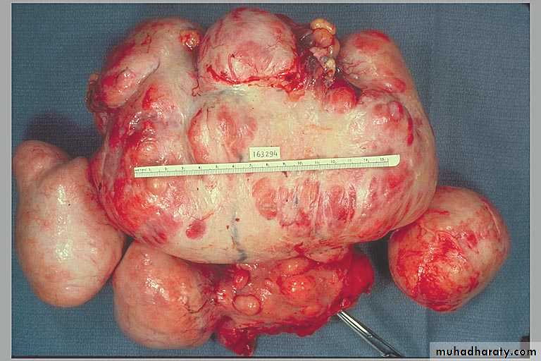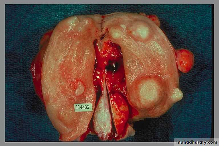 They are sharply circumscribed, firm gray-white masses with a characteristic whorled cut surface.They may occur singly, but are often multiple tumors scattered within the uterus, ranging in size from small seedings to massive neoplasms that dwarf the size of the uterus.