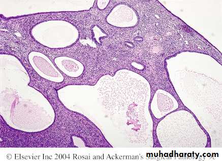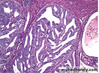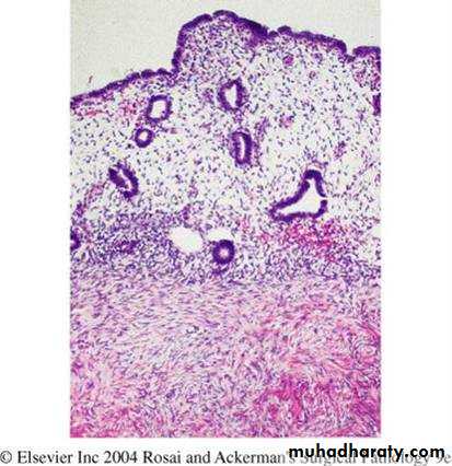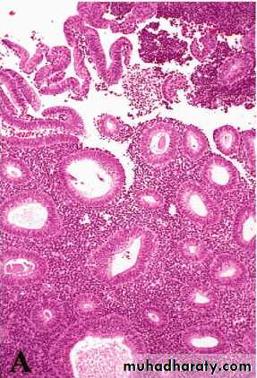Simple hyperplasia involves both the glands & stroma; the normal gland to stroma ratio is maintained. The glands are proliferative and some are cystically dilated.