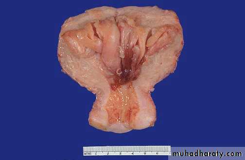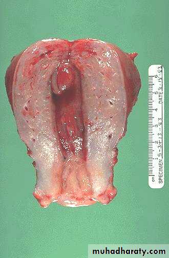 The prominent thickened folds of endometrium in this uterus (opened to reveal the endometrial cavity) are an example of hyperplasia.