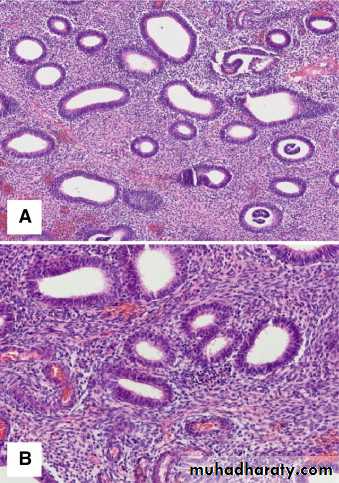 Closely packed endometrial glands with irregular distribution, separated by abundant endometrial stroma (A). Glands are lined by proliferative-type endometrial epithelium without atypia (B).