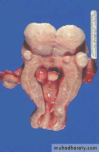 The uterus has been opened revealing several large masses that protrude from under the endometrial mucosa (submucosal). There are also intramural and subserosal examples. One of the submucosal tumor is in the form of pedunculated polyp that has protruded through the cervix