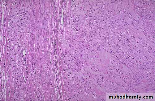 Here is the microscopic appearance of a benign leiomyoma. Normal myometrium is at the left, and the neoplasm is well-differentiated so that the leiomyoma at the right hardly appears different. Bundles of smooth muscle are interlacing in the tumor mass.