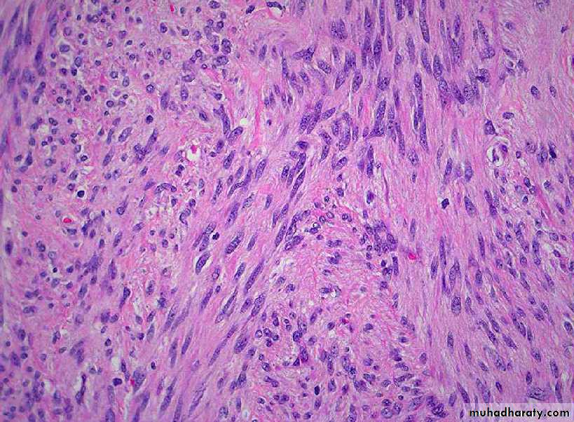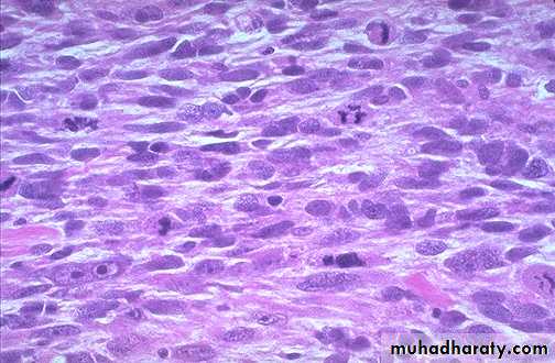 They show a wide range of differentiation, from those that closely resemble leiomyoma to wildly anaplastic tumors.The diagnostic features of leiomyosarcoma include tumor necrosis, cytologic atypia, and mitotic activity.
