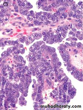 Serous carcinoma forms small tufts and papillary arrangements rather than the glands seen in endometrioid carcinoma, and has much greater cytologic atypia. They are particularly aggressive .