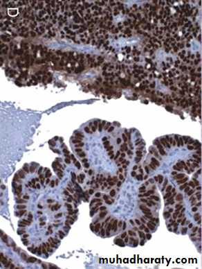 C, displaying formation of papillae and marked cytologic atypia. D, Immunohistochemical stain for p53 reveals accumulation of mutant p53 in serous carcinoma.