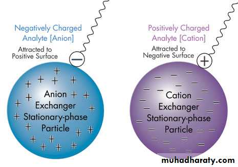 -Ion exchange chromatography retains analyte molecules based on coulombic (ionic) interactions. The stationary phase surface displays ionic functional groups that interact with analyte ions of opposite charge.- This type of chromatography is further subdivided into cation exchange chromatography and anion exchange chromatography. i) Cation exchange chromatography retains positively charged cations because the stationary phase displays a negatively charged functional group:ii) Anion exchange chromatography retains anions using positively charged functional group: