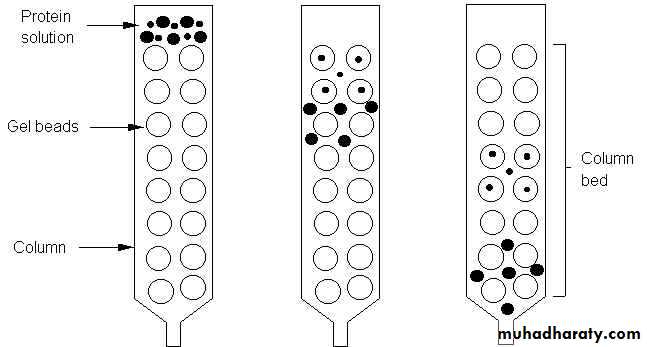 -The solution mixture containing molecules of different sizes( say protein) is applied to the column and eluted with a buffer. -The larger molecules can not pass through the pores of a gel and therefore move faster. -The smaller molecules enter the gel beads and are left behind which come out slowly. By selecting the gel beads of different porosity, the molecules can be separated. -The gel filtration chromatography can be used for an approximate determination of molecular weights. -This is done by using a calibrated column with substances of known molecular weights.