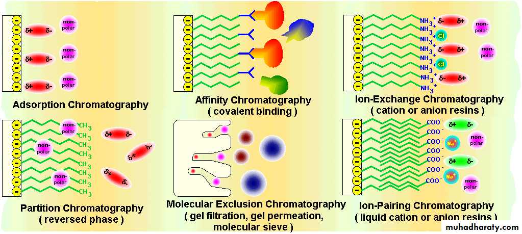 Two ways to classify methodology of chromatography:1)Based on interactions between sample component and stationary phase:i) Partitionii) Adsorptioniii) Ion-exchangeiv)Gel-filtrationv) Affinityvi)High performance liquid chromatography