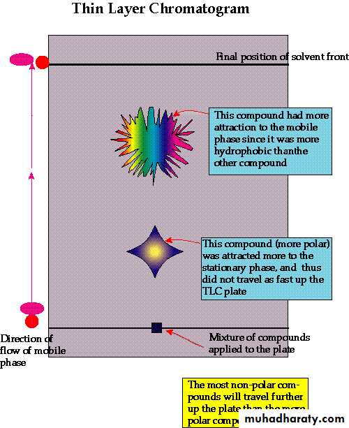 -The process is similar to paper chromatography with the advantage of faster runs, better separations, and the choice between different stationary phases. -A small spot of solution containing the sample is applied to a plate, about one centimeter from the base. The plate is then dipped in to a suitable solvent, such as hexane or ethyl acetate, and placed in a sealed container. The solvent moves up the plate by capillary action and meets the sample mixture, which is dissolved and is carried up the plate by the solvent.- Different compounds in the sample mixture travel at different rates due to the differences in their attraction to the stationary phase, and because of differences in solubility in the solvent.