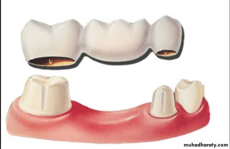 A bridge is a fixed dental restoration (a fixed dental prosthesis) used to replace a missing tooth (or several teeth) by joining an artificial tooth permanently to adjacent teeth or dental implantsINDIRECT RESTORATIONS