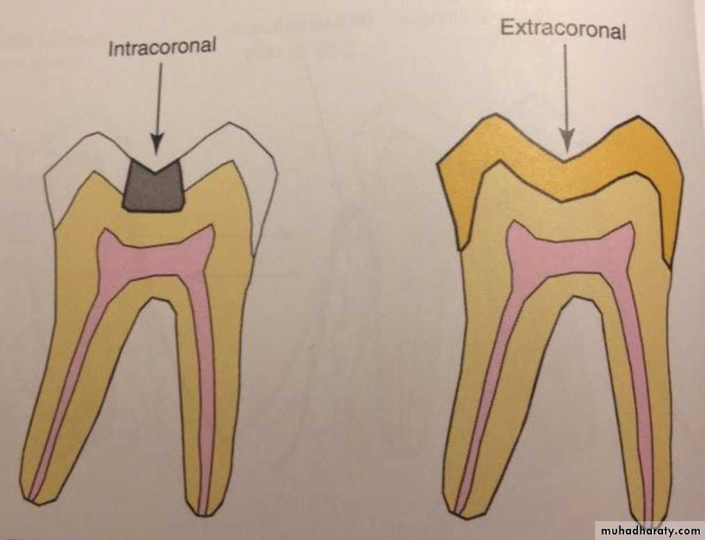 • Intracoronal : all classes of cavity preparations for composite or amalgam, as well as those for gold and porcelain inlays• Extracoronal: Crowns and onlays, as well as veneers.