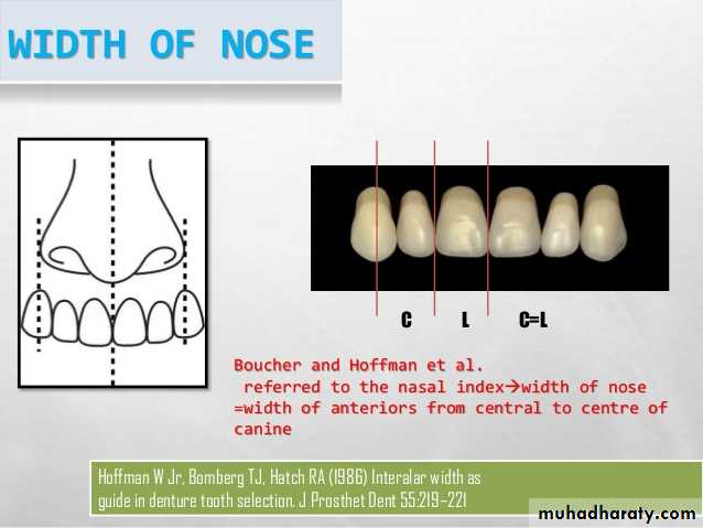 a- The width from the tip of left canine to the tip of right canine is almost equal to the width of the nose (interalar width) when measured by the caliper. (Width of six anterior teeth = interalar width + 7 mm).b- The width of maxillary central incisor equals approximately to 1/16 of bizygomatic width, and the width of maxillary anterior teeth equals to 1/3.36 of bizygomatic width.
