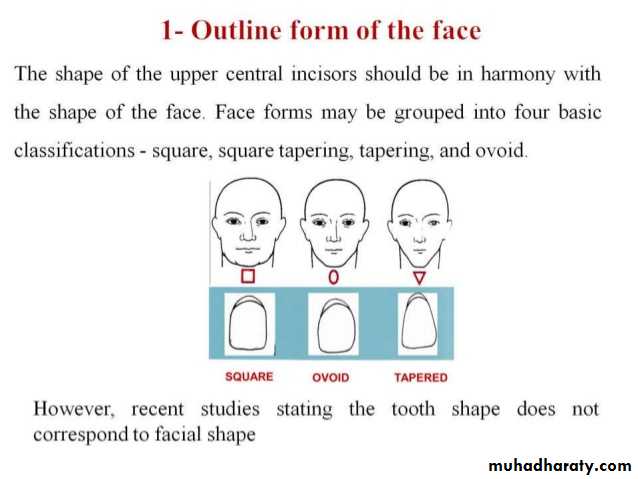According to frontal outline: The face could be classified into: square, ovoid, and tapering. The maxillary central incisor form should be in harmony with patient face.According to profile: The face could be classified into: straight, convex, and concave. The labial surface of maxillary central incisor viewed from mesial aspect should be in harmony with profile of face.