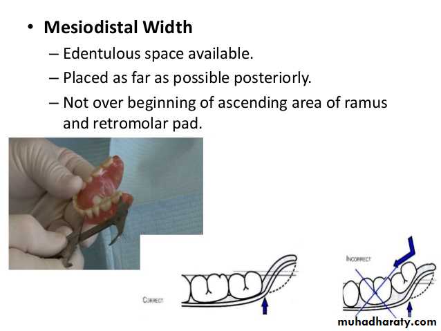 For mandibular posterior teeth, the mesiodistal lengths should be equal to distance between the canine line and anterior border of retromolar pad. If the residual ridge anterior to retromolar pad area slopes upward, smaller teeth or even fewer in number must be used. Placing a tooth on an inclined plane (steep anteroposterior ridge slope) should be avoided, otherwise this would lead to forward displacement of the denture and dislodgment of denture occurs. Similarly the teeth should not be placed over displaceable tissues like the retromolar pad as it will cause tipping of the denture during function. In case with inadequate mesiodistal length, the premolar can be neglected.
