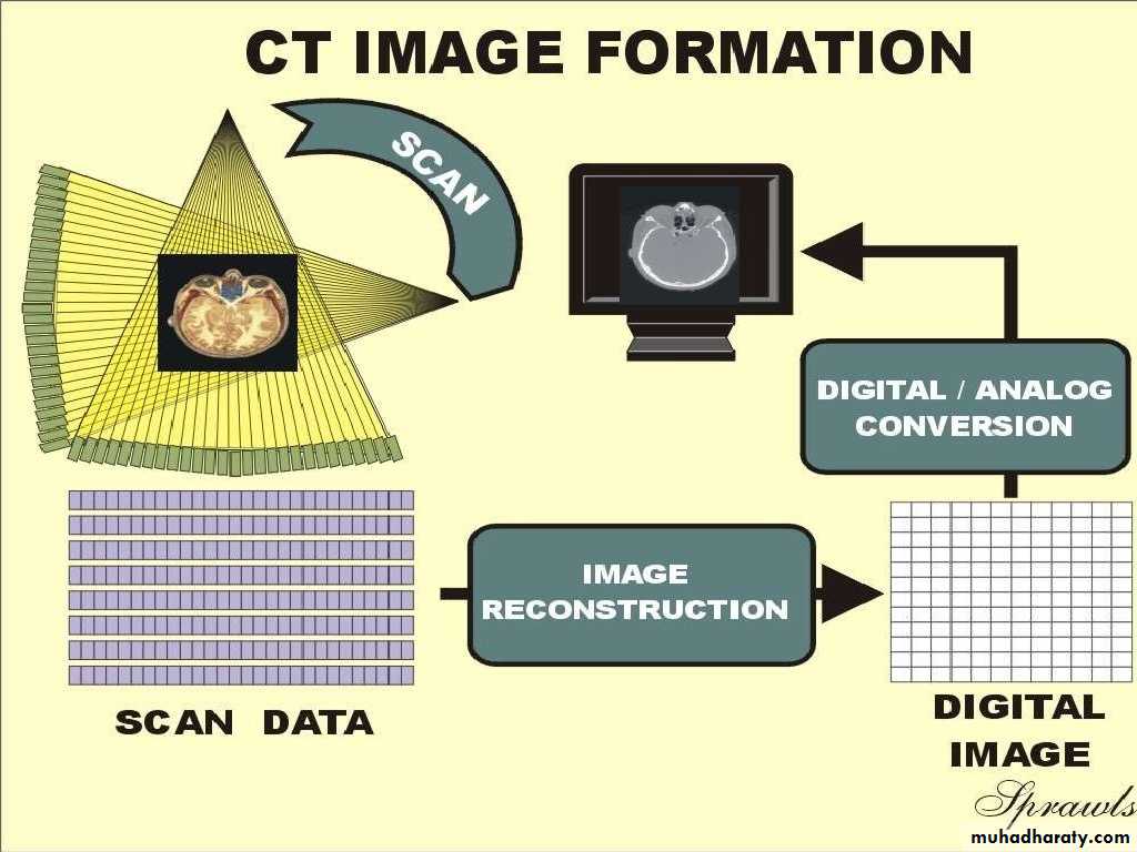 X-ray attenuation was detected by detector & DAS system, follow by math. model (back projection model) to calculate the value of pixels then become a image.