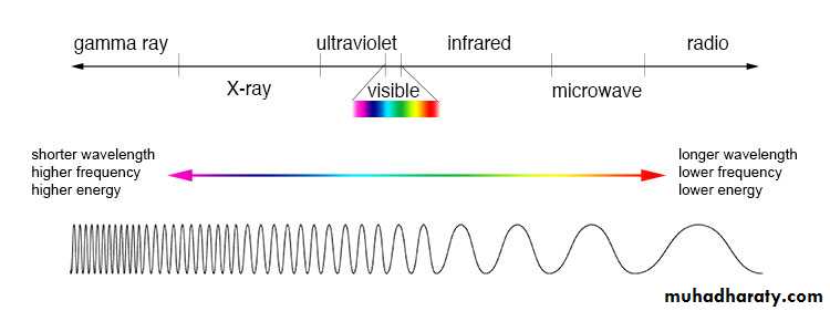 • Electromagnetic radiation consists of energy (a particle) in small packets known as photons or quanta. They are grouped according to their wave length and frequency.•