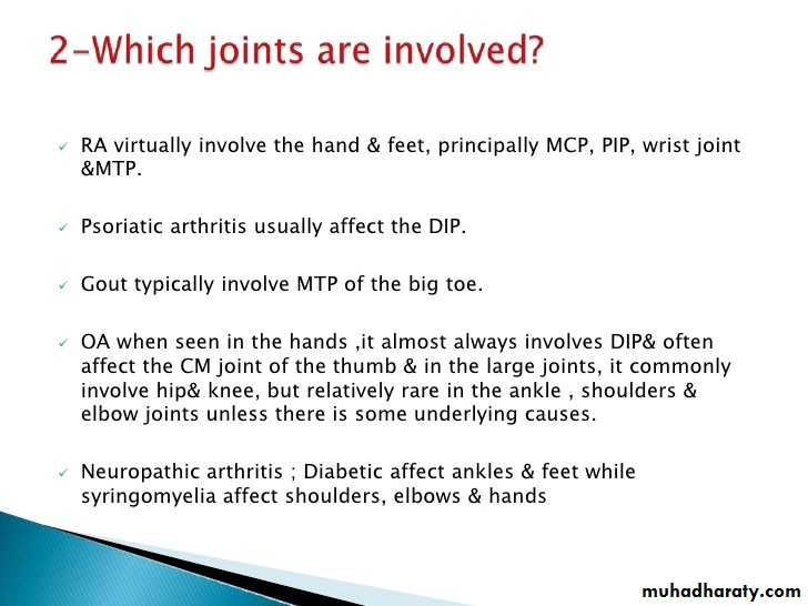 1.Affect lower>upper extremity, small>large joints2.First MTP is the most common site
