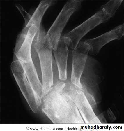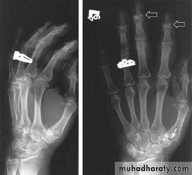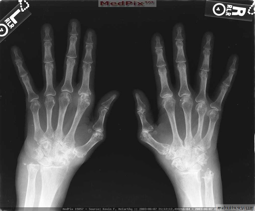 Severe erosive changes at radio-ulnar joints carpal bones at the metacarpal heads
