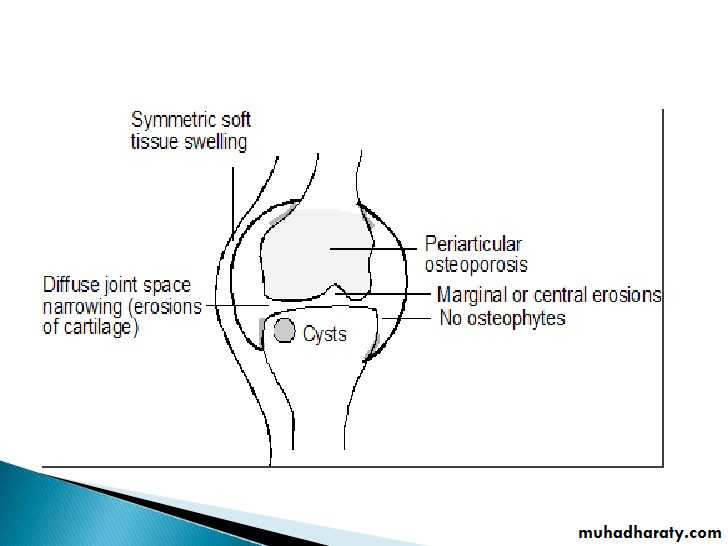 1.soft tissue swelling due to effusion, tenosynovitis, and edema2.Symmetric Periarticular osteopenia