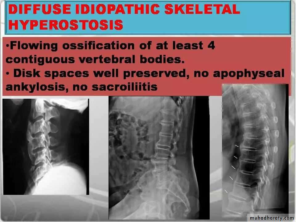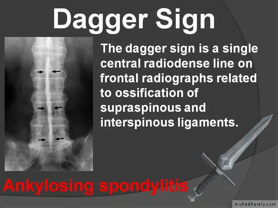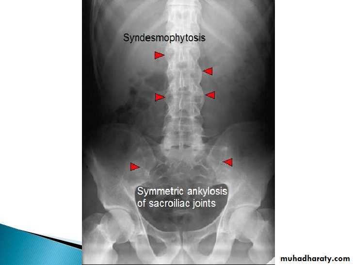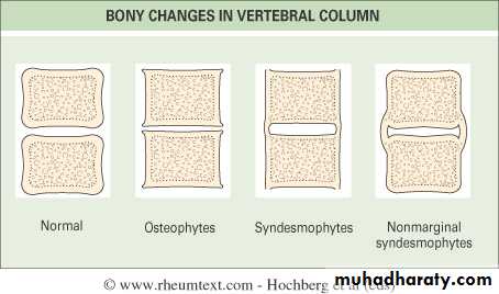 • Progressive mineralization of Sharpey’s fibres to form osseous bridging syndesmophytes