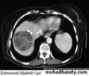 Hydatid cysts may be single or multiple; a few show calcified walls. Daughter cysts may be seen within a main cyst at both US and CT.