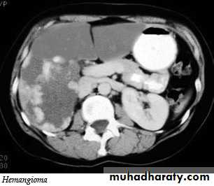 They are the commonest benign tumors in liver. They are common incidental finding and rarely requires treatment. It may cause significant hemorrhage, especially after trauma ,so percutaneous biopsy should be avoided. Hemangiomas are typically well-defined, peripheral echogenic masses at US. At CT, there is usually a characteristic peripheral, nodular and centripetal enhancement after IV contrast. MRI shows uniform very high signal intensity on T2 images.Liver abscess