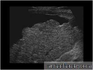 At US, they may show increased echogenicity or, more usually, decreased echogenicity compared with the surrounding parenchyma. At times, they show a complex echo pattern and when they undergo central necrosis they may even resemble cysts.