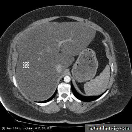 CT : IV contrast is usually given to emphasize the density between normal parenchyma and pathological lesions. The liver has dual blood supply from hepatic artery and portal vein. The liver is divided into 8 segments determined by hepatic and portal veins. The normal liver is higher or equal in density to the spleen. The normal intrahepatic bile ducts are not visible.