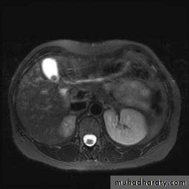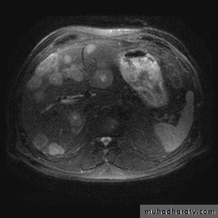 MRI : It is used as a problem-solving technique to give additional information to US and CT scan. It is a good technique for demonstrating primary and secondary tumors and is often used when surgery is contemplated. IV contrast is used to improve visualization and help characterize lesions.