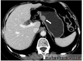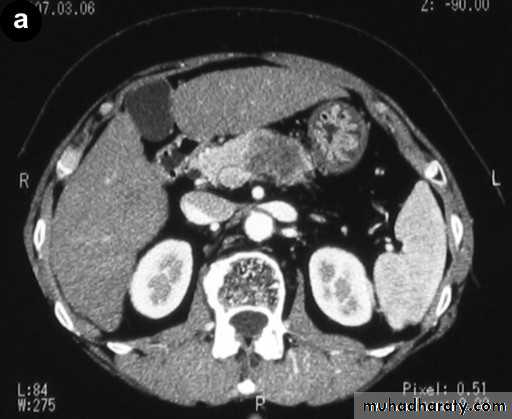 On contrast-enhanced CT, the tumor appears of lower density compared to the normal pancreatic tissue. The main pancreatic duct may be dilated distal to an obstructing mass . Most tumors are irresectable at time of diagnosis because of involvement of regional LAP, liver metastases and regional vascular encasement.