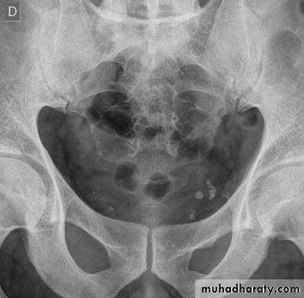 4. Uterine fibroids: irregular shaped well-defined calcifications conforming to the spherical outline of fibroids