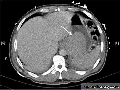 Splenic infarction occur secondary to severe pancreatitis, pancreatic carcinoma, sickle cell and trauma. It show focal or complete loss of normal enhancement following IV contrast