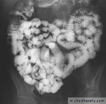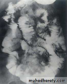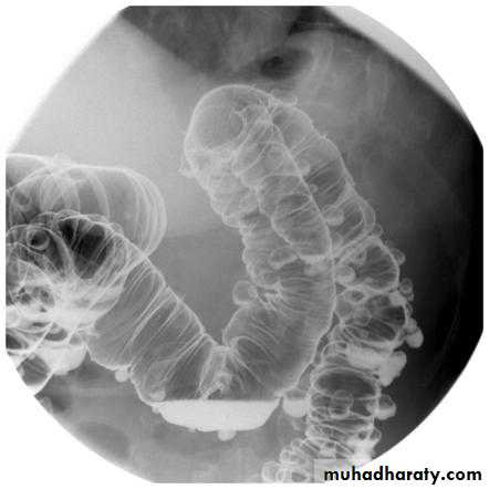 The valvulae conniventes (seen in proximal and mid small bowel) are always closer together than the colonic haustra and cross the width of the bowel , often giving "stack of coins" appearance