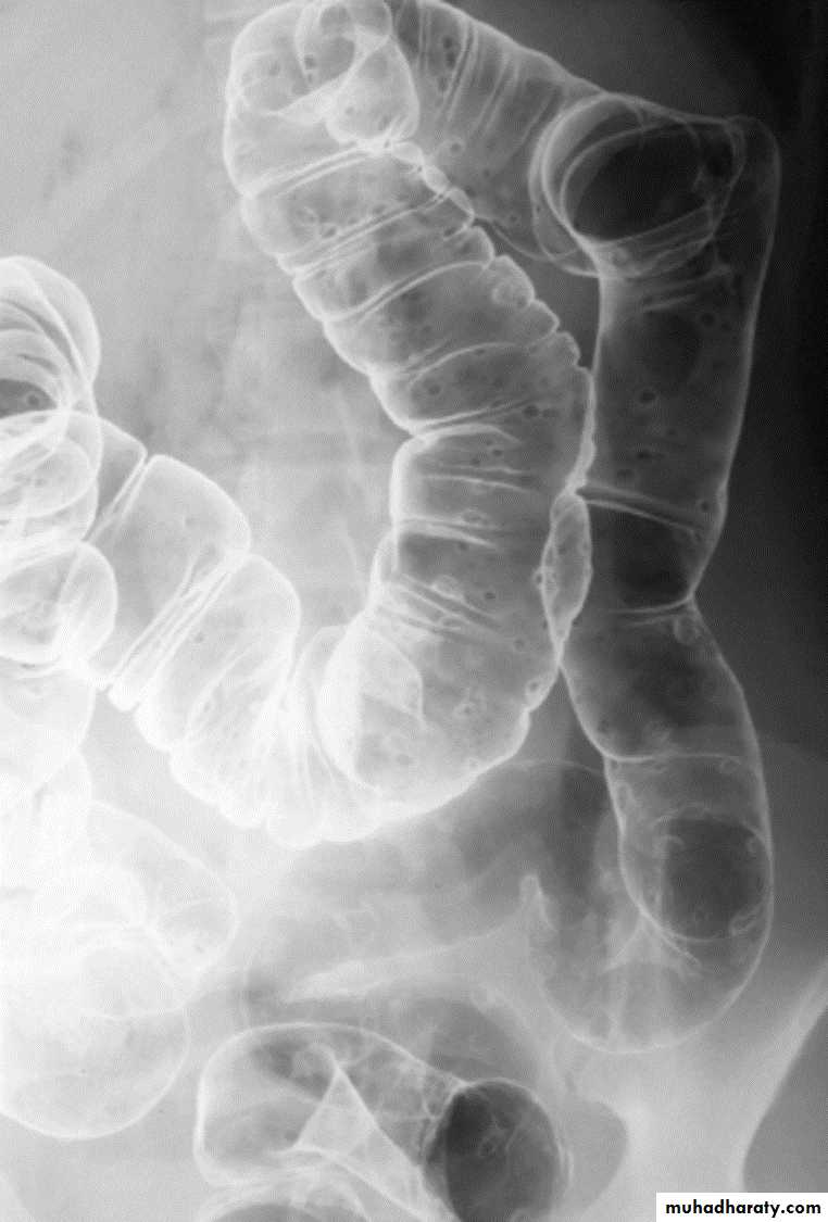 The colonic haustra ,which usually form incomplete bands across the colonic gas shadows, are always present in the ascending and transverse colon, but may be absent distal to the splenic flexure
