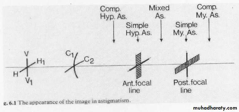 So as we see in (1), the image of vertical meridian is focused as (A1) line on the retina (normal), while the horizontal meridian image focused behind the retina (hypermetropic) and blurred on retina as (B1) line, so it is called "Simple hypermetropic astigmatism". In (2), vertical meridian image is focused in front of the retina (myopic) and its image on retina is blurred (A2), while horizontal meridian image (B2) is focused on the retina (normal), so it is called "Simple myopic astigmatism". In (3) and (4) both image are focused behind or in front of retina respectively and called "Compound hypermetropic or myopic astigmatism". While in (5), one image focused in front of and the other behind the retina and so it is called "Mixed astigmatism".