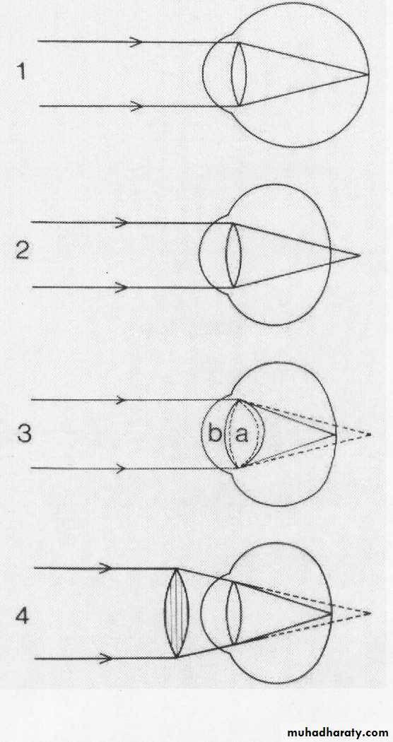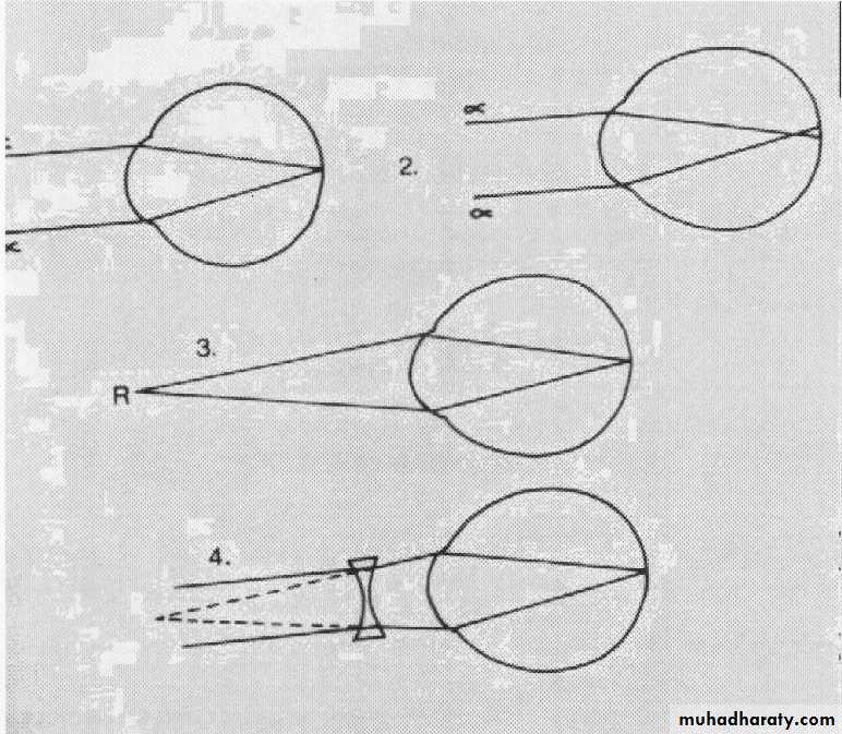 2- Pathological (progressive): >6D, before the age of 4y, progress even after age of 20y, real pathological process and cannot be corrected as the real pathological process still found (if the patient has myopia of 20D, then even if we give glasses with -20D, he will still having refractive error).
