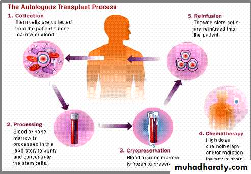 Autologous HSCT requires the extraction (apheresis) of haematopoietic stem cells (HSC) from the patient and storage of the harvested cells in a freezer. The patient is then treated with high-dose chemotherapy with or without radiotherapy with the intention of eradicating the patient's malignant cell population at the cost of partial or complete bone marrow ablation (destruction of patient's bone marrow function to grow new blood cells)The patient's own stored stem cells are then transfused into his/her bloodstream, where they replace destroyed tissue and resume the patient's normal blood cell production.