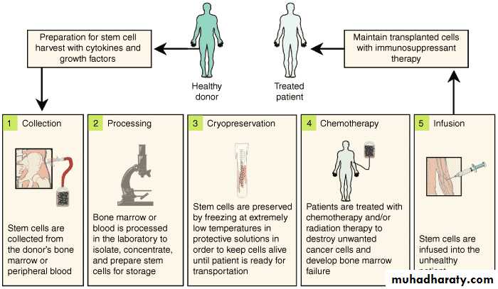 Healthy marrow or stem cells from a donor are infused IV into the Recipient who has been suitably conditioned The conditioning treatment (chemotherapy with or without radiotherapy Destroy malignant cells and immunosuppresses the recipientAs well as ablating the recipients haematopoietic tissue the injected donor cells home to the marrow , engraft and Produce enough erythrocytes, granulocytes and platelets