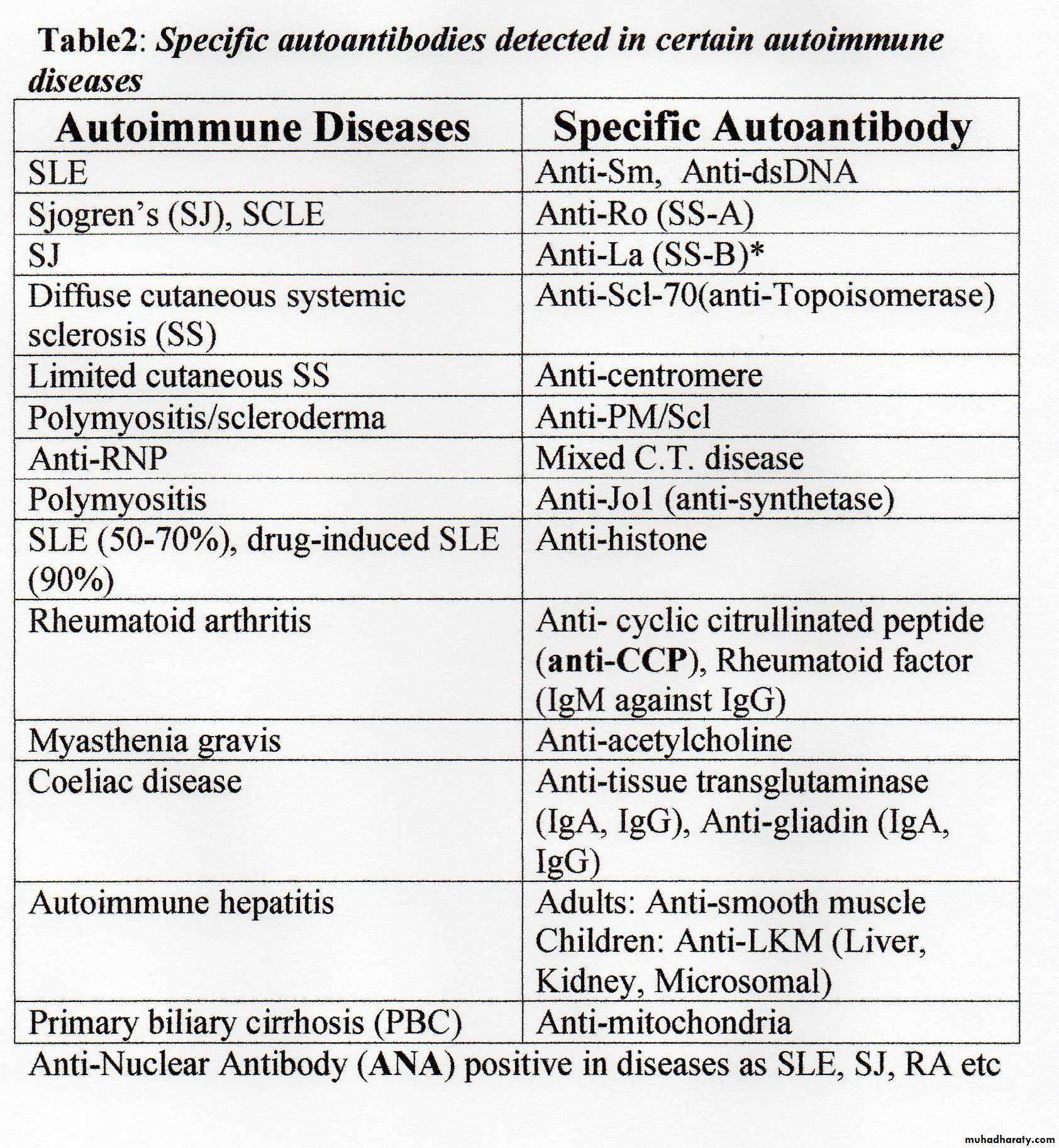 1. Autoantibodies – see the Table2. Total immunoglobulin concentration may be increased