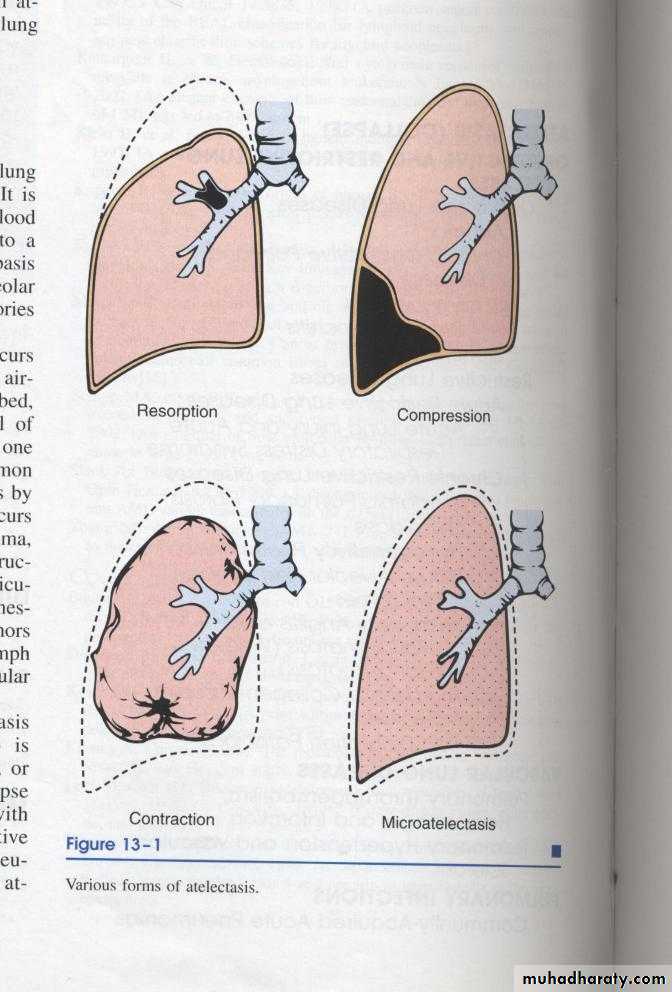 Compression atelactasis: usually associated with accumulation of blood, fluid, or air in the pleural cavity which mechanically collapsed the adjacent lung.