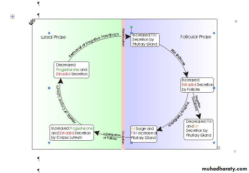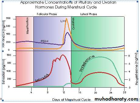 Dr. Asmaa TahaThe female menstrual cycle is determined by a complex interaction of hormones. The predominant hormones involved in the menstrual cycle are gonadotropin releasing hormone (GnRH), follicle stimulating hormone (FSH), luteinizing hormone (LH), estrogen, and progesterone. GnRH is secreted by the hypothalamus, the gonadotropins FSH and LH are secreted by the anterior pituitary gland, and estrogen and progestin are secreted at the level of the ovary. GnRH stimulates the release of LH and FSH from the anterior pituitary, which in turn stimulate release of estrogen and progestin at the level of the ovary.