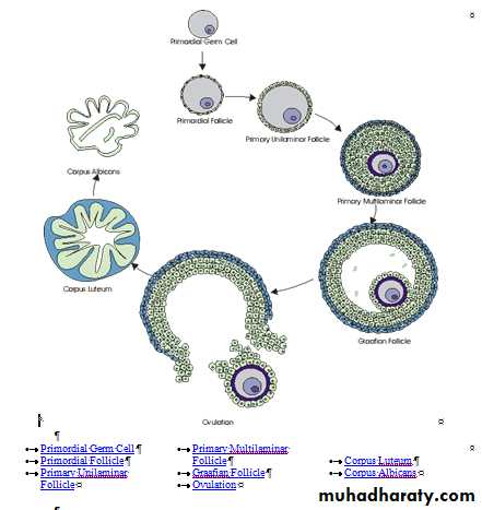 During embryogenesis, primordial germ cells develop from mesoderm in the allantois, migrate to the ovary, and then proliferate and differentiate into primordial follicles. Primordial follicles are arrested in growth until menarche, and some remain so until menopause. At the beginning of each menstrual cycle, between 15 and 20 primordial follicles develop into primary follicles. Under the influence of gonadotropins and ovarian hormones, primary follicles grow; ultimately, however, only one primary follicle develops into a Graafian follicle and the remaining follicles undergo atresia. The Graafian follicle is ovulated, expelling the oocyte and corona radiate into the peritoneum while the zona granulosa cells remain in the ovary. The zona granulosa and surrounding theca cells develop into the corpus luteum, which in turn becomes atretic after 14 days. After several months, the corpus luteum has fully devolved into the corpus albicans. Follicular development from primary follicle to the last stage of corpus luteum requires approximately three complete menstrual cycles.