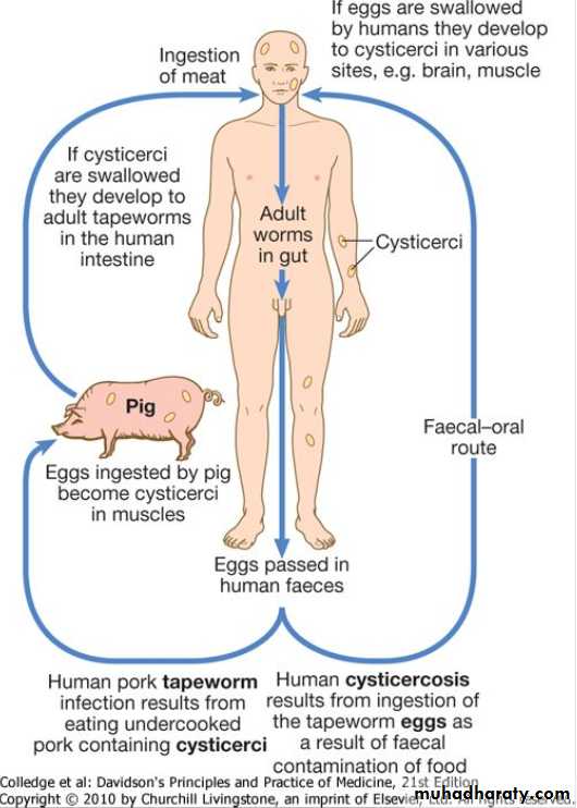 Intestinal tapeworms: Taenia saginata, T. solium, Diphyllobothrium latum, Hymenolepis nana.Tissue-dwelling cysts or worms: Taenia solium, Echinococcus granulosus .