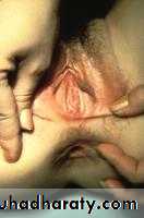 observation of the introitus will display a tense bulging bluish membrane which is the hymen.